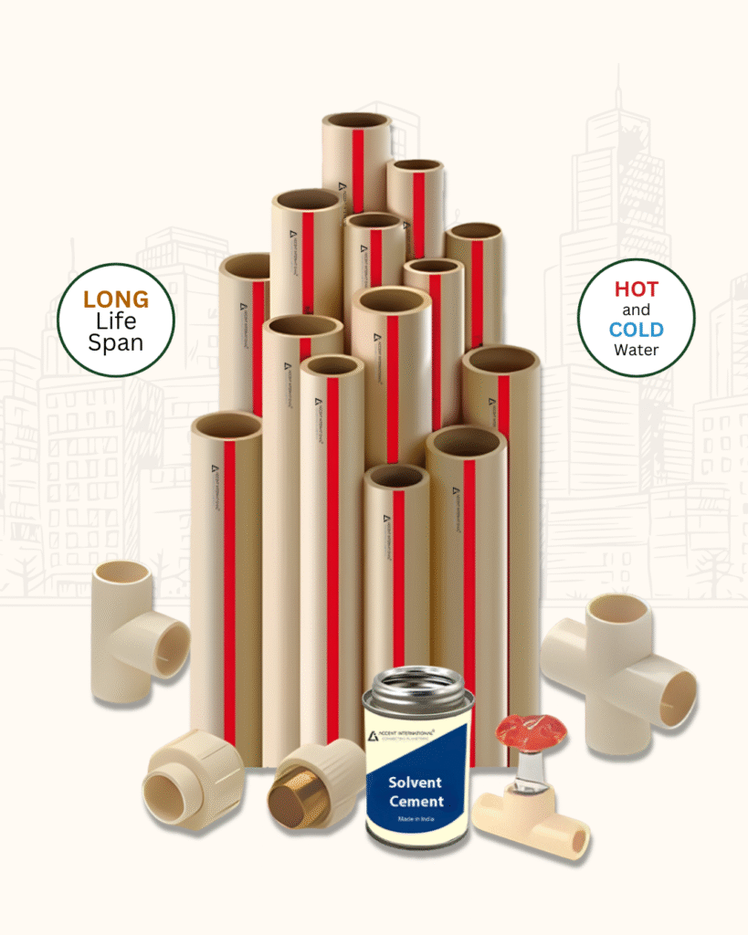 ACCENT CPVC (Chlorinated Polyvinyl Chloride) Plumbing Pipes are specially engineered for hot and cold water distribution in residential, commercial, and industrial buildings. Manufactured from high-temperature resistant, corrosion-free material, CPVC pipes ensure long-term performance with excellent mechanical strength. Their smooth inner surface reduces frictional losses, enabling higher flow efficiency and consistent water pressure. Ideal for concealed and exposed installations, CPVC plumbing systems offer a safe, reliable, and maintenance-free solution for modern plumbing needs.