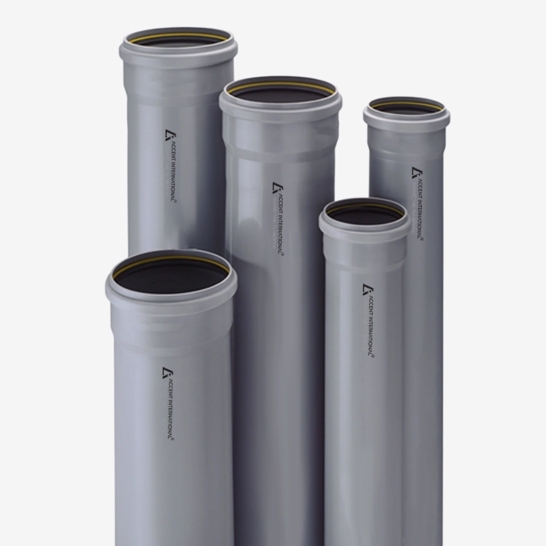 Accent uPVC SWR (Soil, Waste & Rainwater) Pipes are designed for efficient and hygienic drainage of wastewater, soil, and rainwater. Made from high-quality uPVC, these pipes offer smooth flow, corrosion resistance, and leak-proof performance. Available in 40–160 mm sizes, Type A & Type B, with 3 & 6 meter lengths, they are ideal for residential, commercial, and industrial drainage systems.
